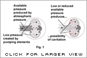 As you know, liquid is not “sucked” into a pump, it is pushed. The liquid being pushed into the pump (available pressure) compensates for the low pressure created by the rapid movement of fluid by the pumping parts. Consequently, when the available pressure is reduced or the local pressure in the pump cavity is low, vapor formation occurs or increases (see Fig. 1).